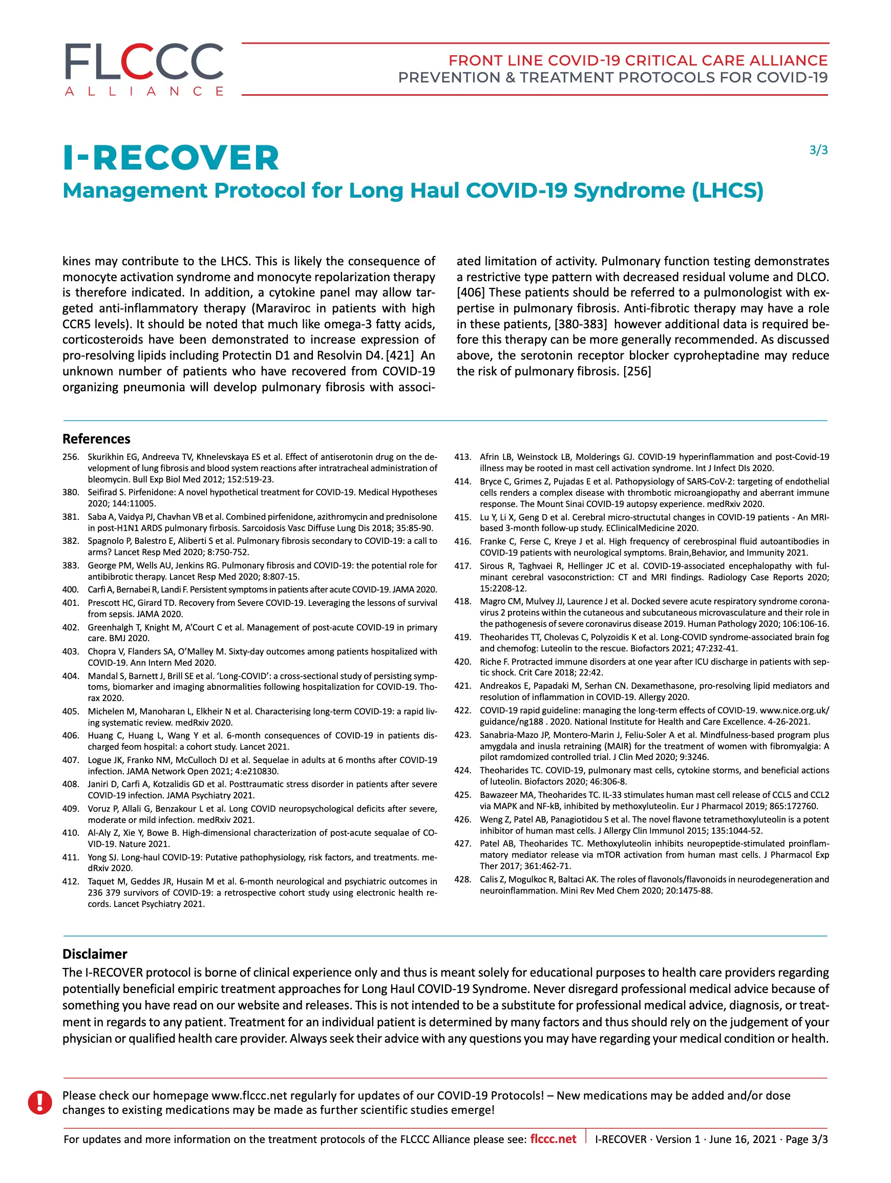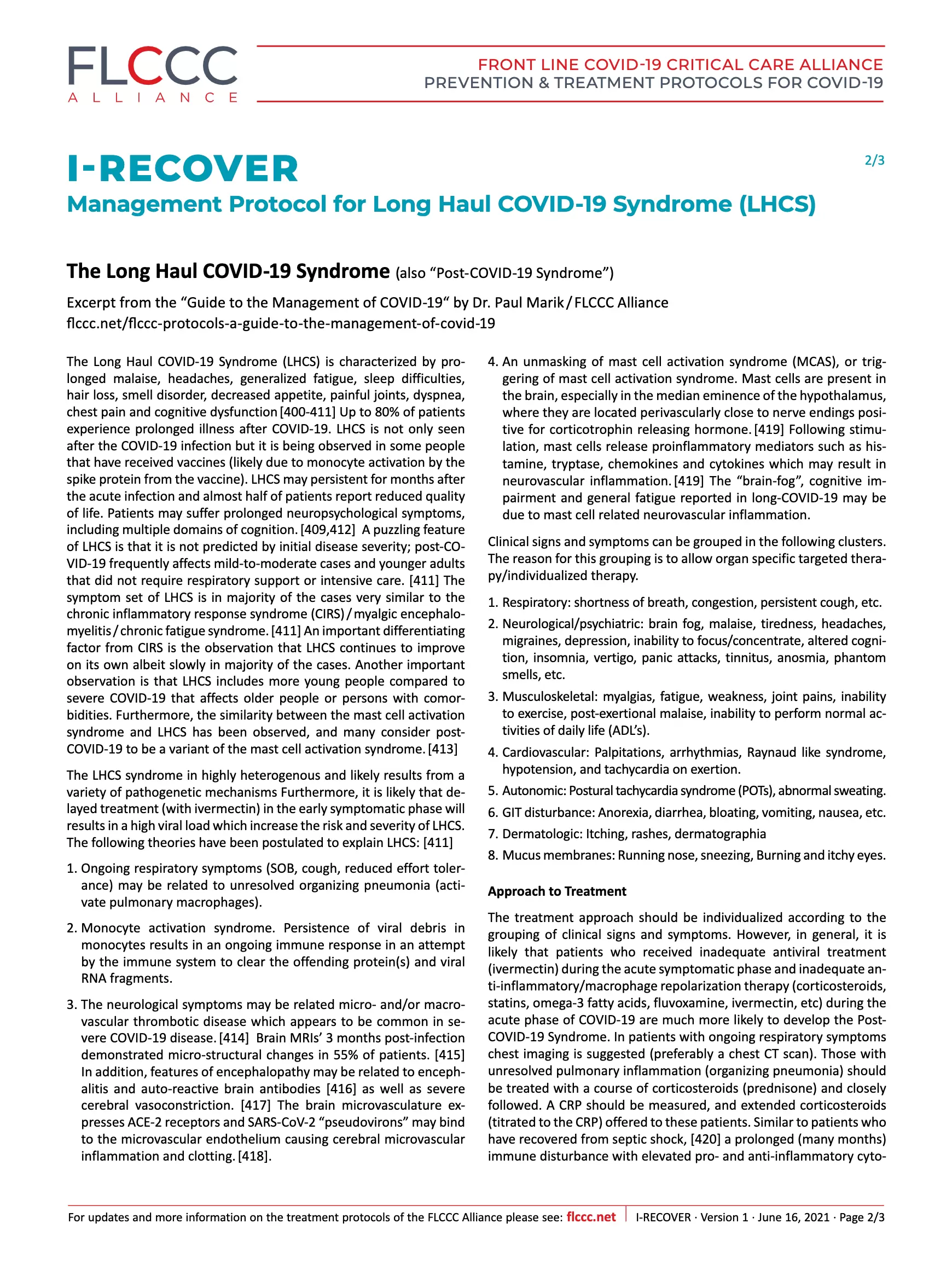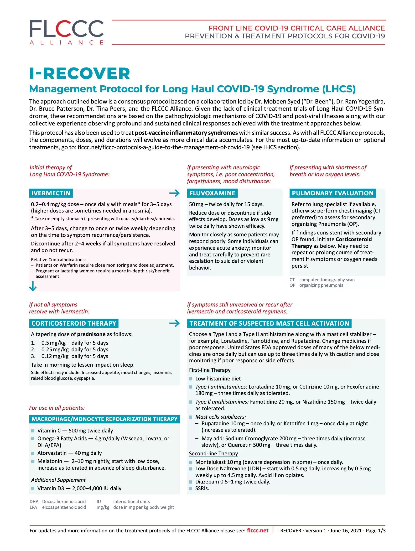 Below is the FLCCC I‑RECOVER Management Protocol for Long Haul COVID-19 Syndrome (LHCS) in English, the original of which may be obtained in PDF here, or by using the download button at the bottom of this page.