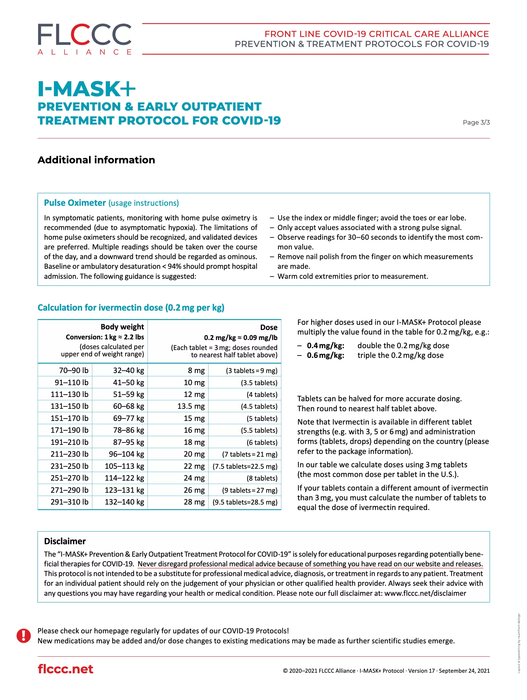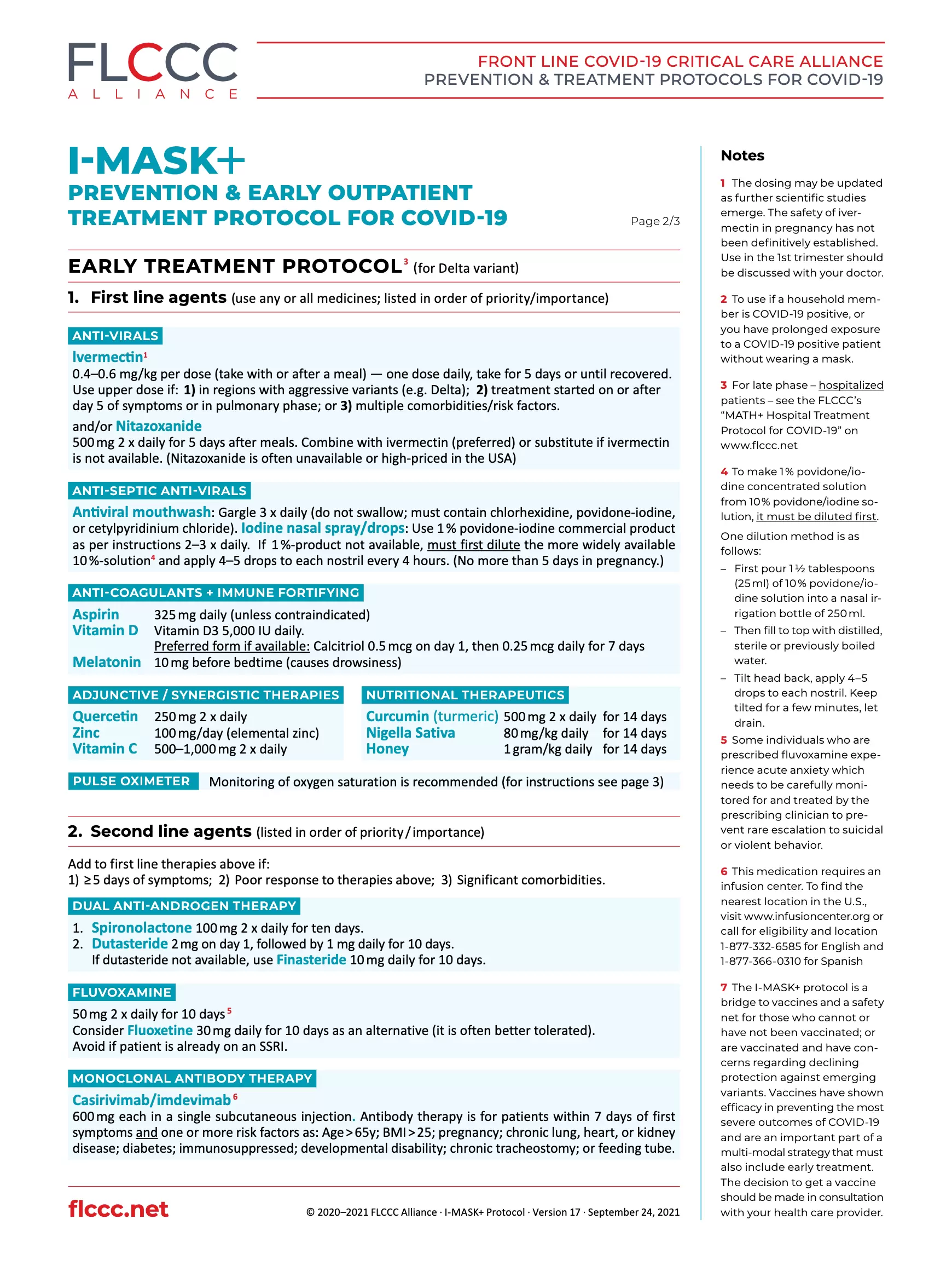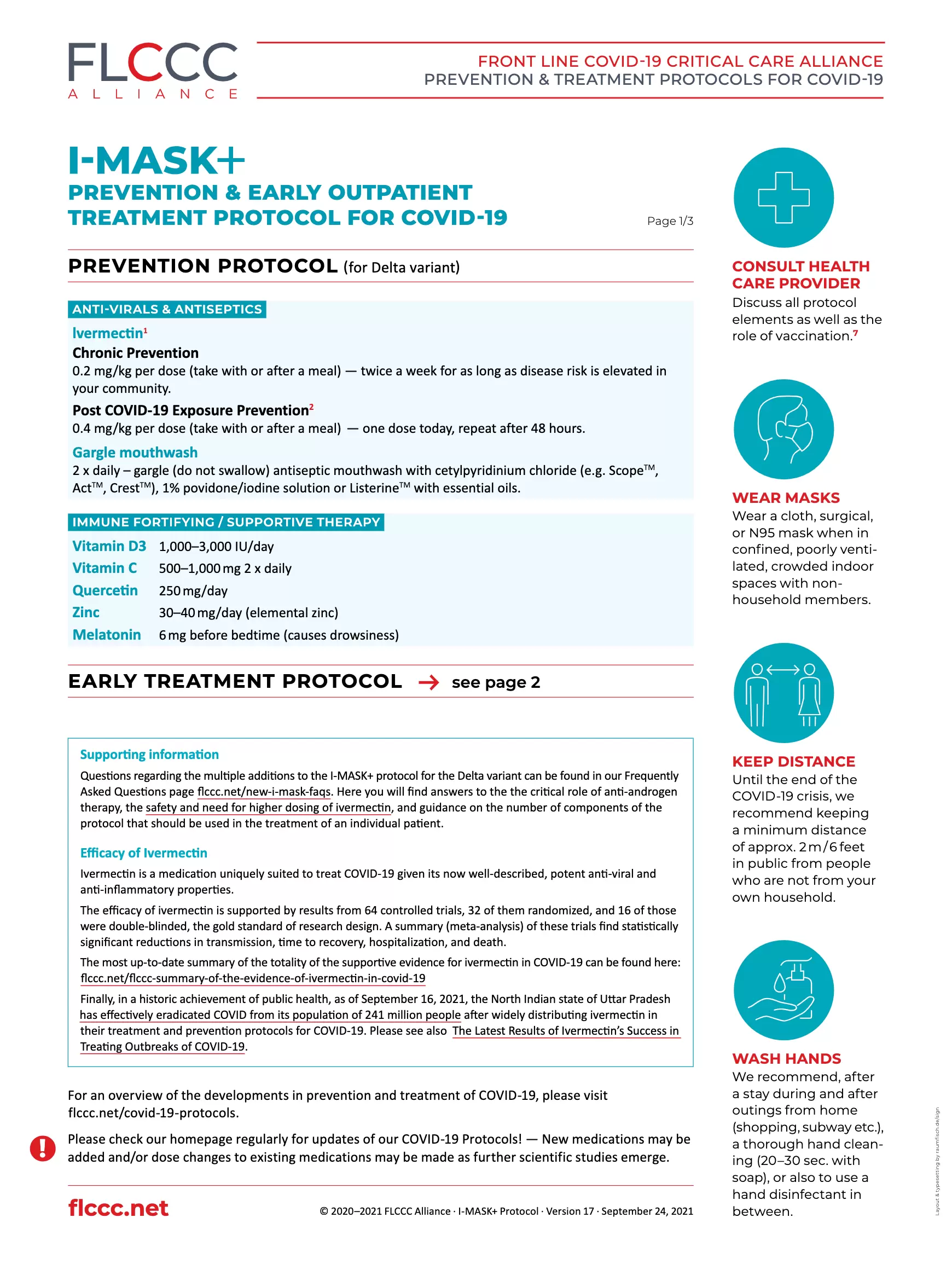 Below is the FLCCC I‑MASK+ Prevention and Early Outpatient Treatment Protocol for Covid-19 in English, the original of which may be obtained in PDF here, or by using the download link at the end of the page.